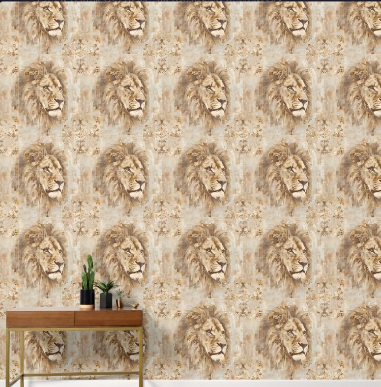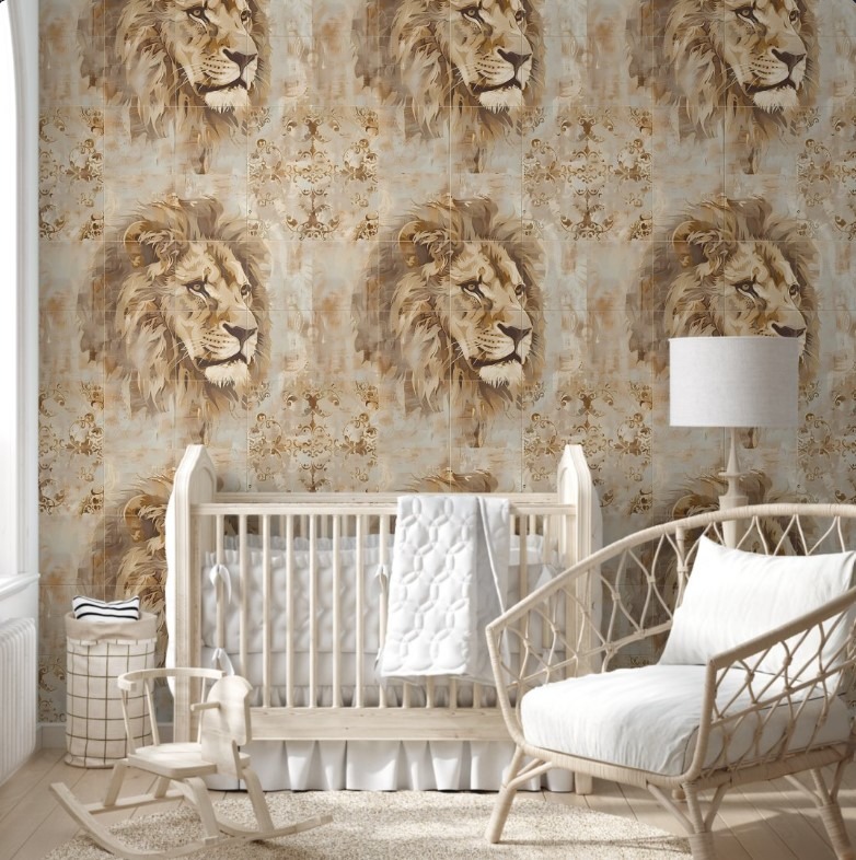 Enhance your interior with the powerful elegance of the Noble Lion – Beige, Gold, White – Traditional wallpaper. This striking design features a detailed lion profile framed by intricate scrollwork in warm beige and gold tones, exuding regal charm. Ideal for creating a focal point in any room, this peel-and-stick wallpaper offers an easy, renter-friendly solution to add a sophisticated yet bold statement to your home decor.